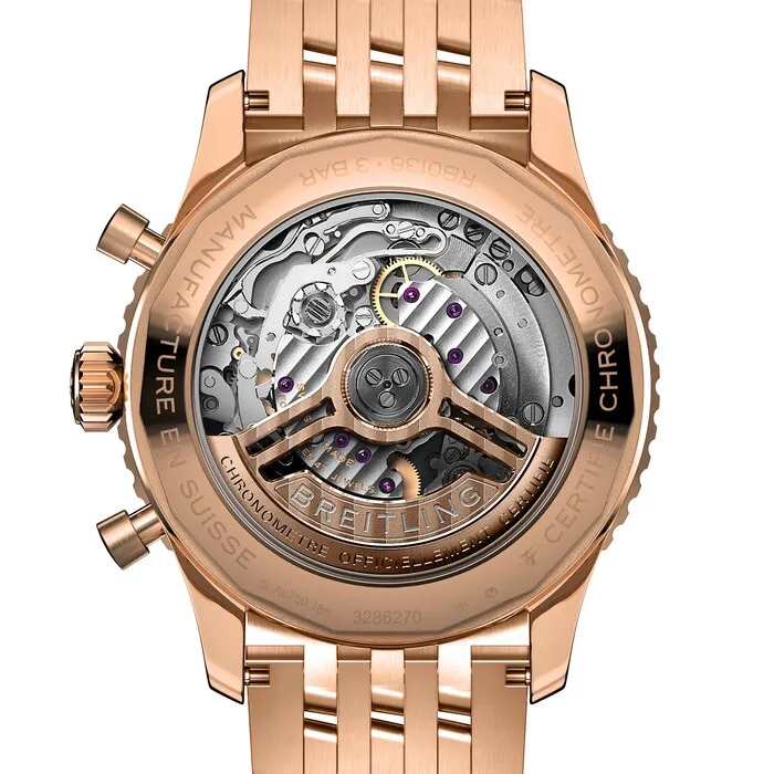Inside beats the Breitling Manufacture Caliber B01, a COSC-certified automatic movement celebrated for its precision, durability, and seamless chronograph operation. With 47 jewels, a 70-hour power reserve, and a frequency of 28,800 vibrations per hour, it exemplifies technical excellence. A sapphire exhibition caseback invites you to admire its refined architecture and the gold rotor engraved with Breitling’s emblem.