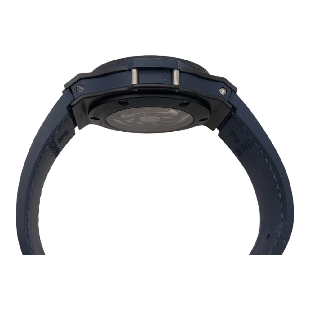 The blue dial features chronograph counters, luminous hands, and indices for excellent readability. The watch is fitted with a durable black structured rubber strap, ensuring both comfort and resilience, while the black ceramic bezel secured with Hublot’s signature H-shaped titanium screws reinforces its bold character.