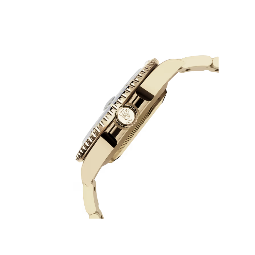 This Submariner features a 41 mm Oyster case in yellow gold, outfitted with a Triplock screw-down crown and waterproof sapphire crystal with Cyclops date magnifier. The Oyster bracelet, constructed from solid gold, offers durability and comfort, with the Oysterlock clasp for security and the Glidelock extension system for easy adjustment without tools.